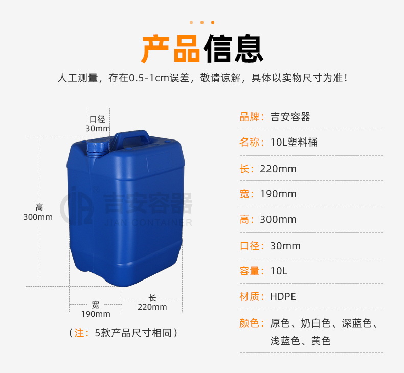 小口塑料桶:采用全新聚乙烯原料吹塑工藝制作而成,具有耐腐蝕,耐酸堿特性,小口設(shè)計(jì)密封性能強(qiáng),廣泛應(yīng)用于化工、清潔、食品、添加劑、汽車等各行業(yè)液體包裝。